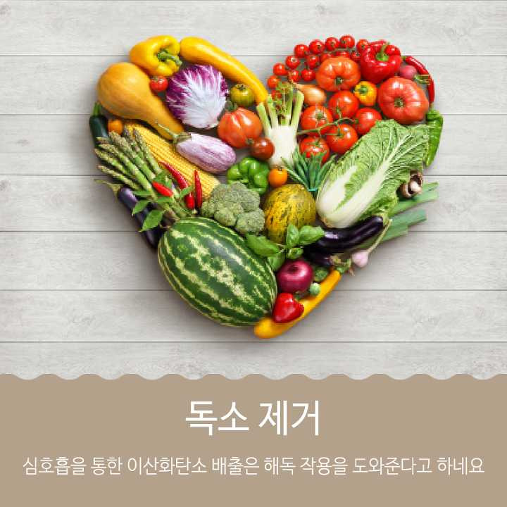 의식적으로 숨쉬기를 자주 해주면 체내 이산화탄소가 많이 빠져나가 해독 작용을 원할하게 해주어 체내 독소 배출에 도움을 준다고 해요, 또한 심호흡은 체세포 증가에도 도움을 준다고 합니다 Nếu bạn có ý thức hô hấp thường xuyên, cơ thể bạn sẽ giải phóng rất nhiều carbon dioxide, điều này sinh tác động giải độc, sẽ giúp bạn đào thải chất độc trong cơ thể, ngoài ra hít thở sâu cũng giúp gia tăng các tế bào soma.
